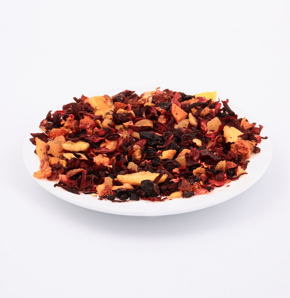 Angolos ízesítésű gyümölcs tea. Alma, narancshéj, csipkebogyó és gyömbér darabkákkal.